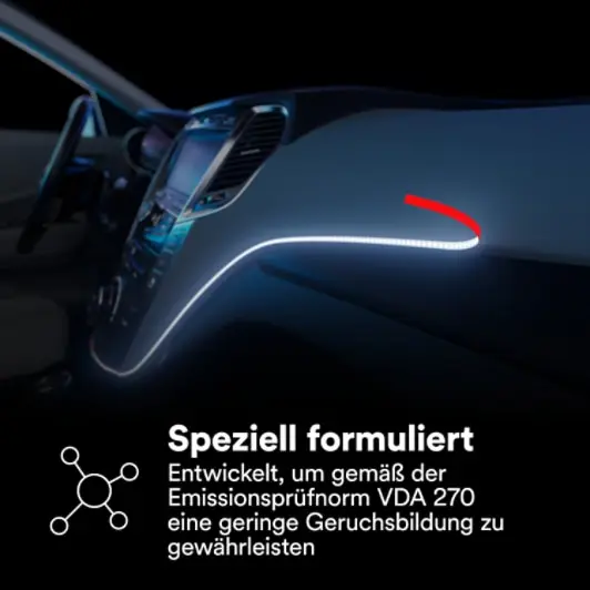 • um 85% reduzierter Anteil flüchtiger, organischer Bestandteile (VOC; getestet nach VDA278)