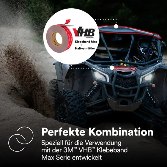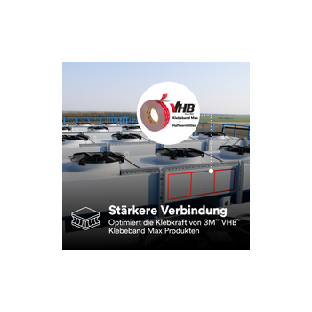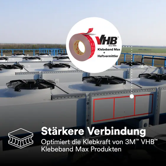 Die Klebebänder der 3M™ VHB™ Max-Serie bieten eine doppelt so hohe Scher- und Zugfestigkeit (in Kombination mit dem VHB™ Max Haftvermittler) wie die bekannten 3M™ VHB™-Standard Tapes. Die Verbindung mit dem Spezialprimer ermöglicht Festigkeiten auf dem Niveau von Polyurethan-Klebstoffen.